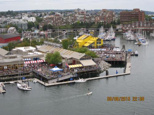 Hier sieht man Granville Island. Das ist eine Halbinsel in Vancouver, mit einer riesigen Markthalle und einem wunderschönen Blick auf den Hafen in Vancouver.